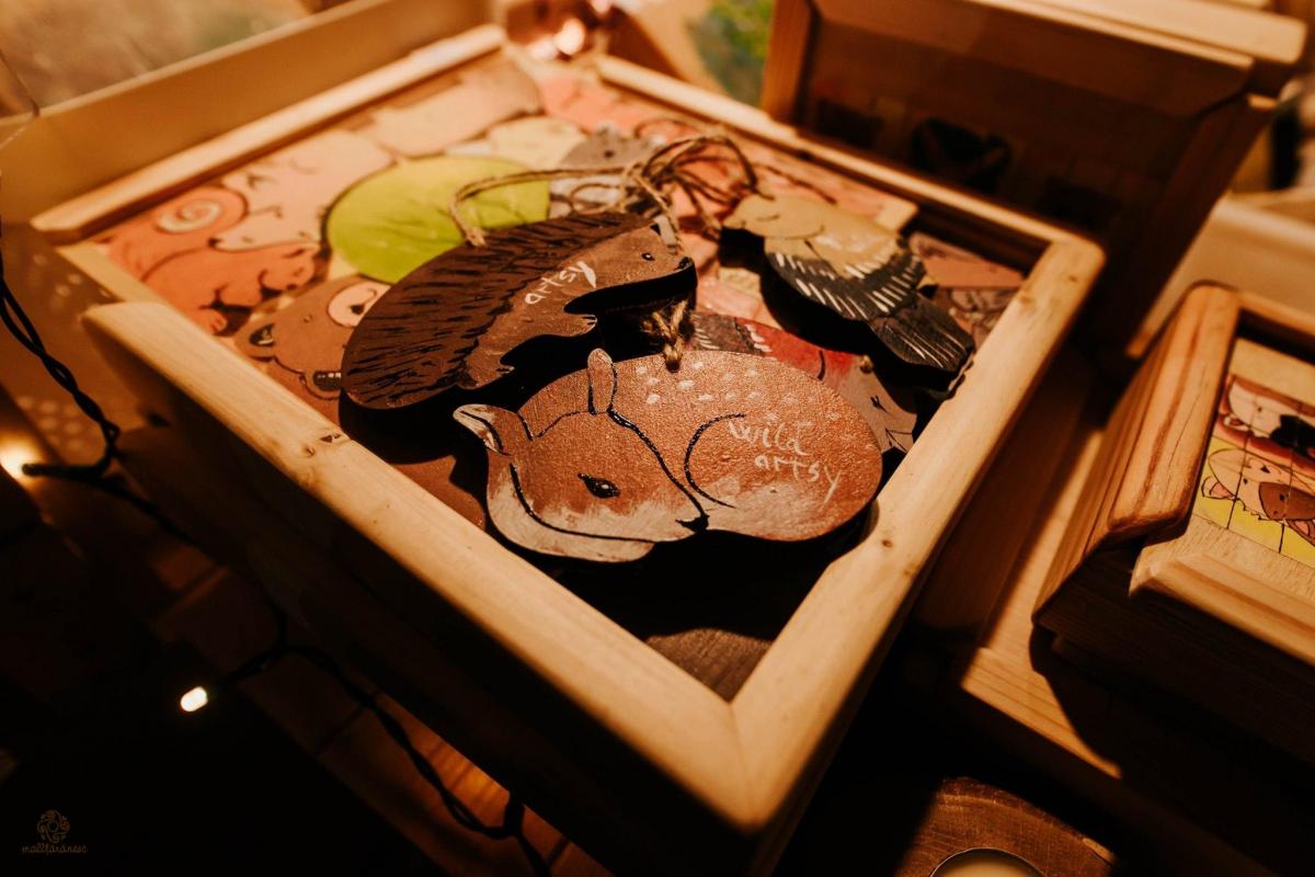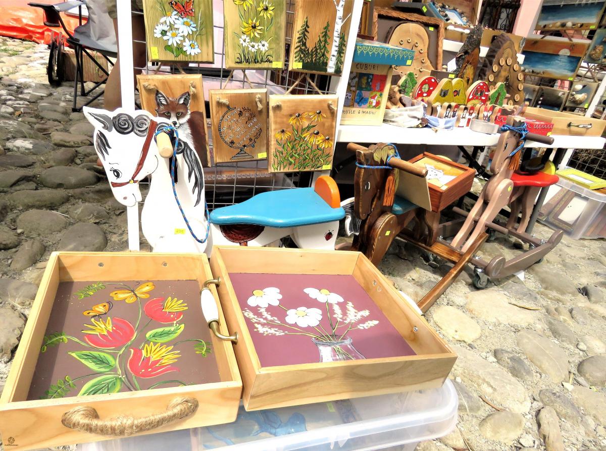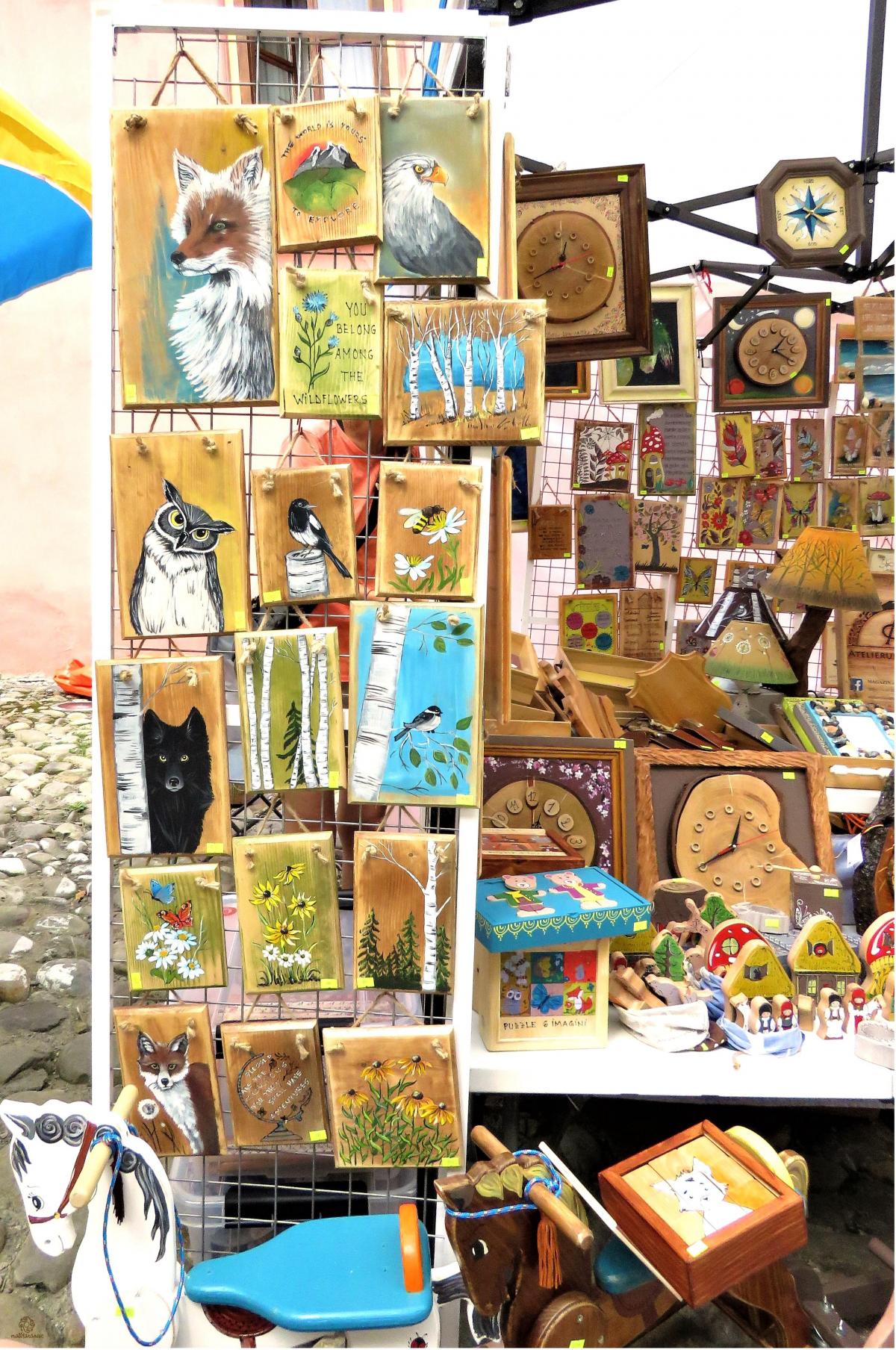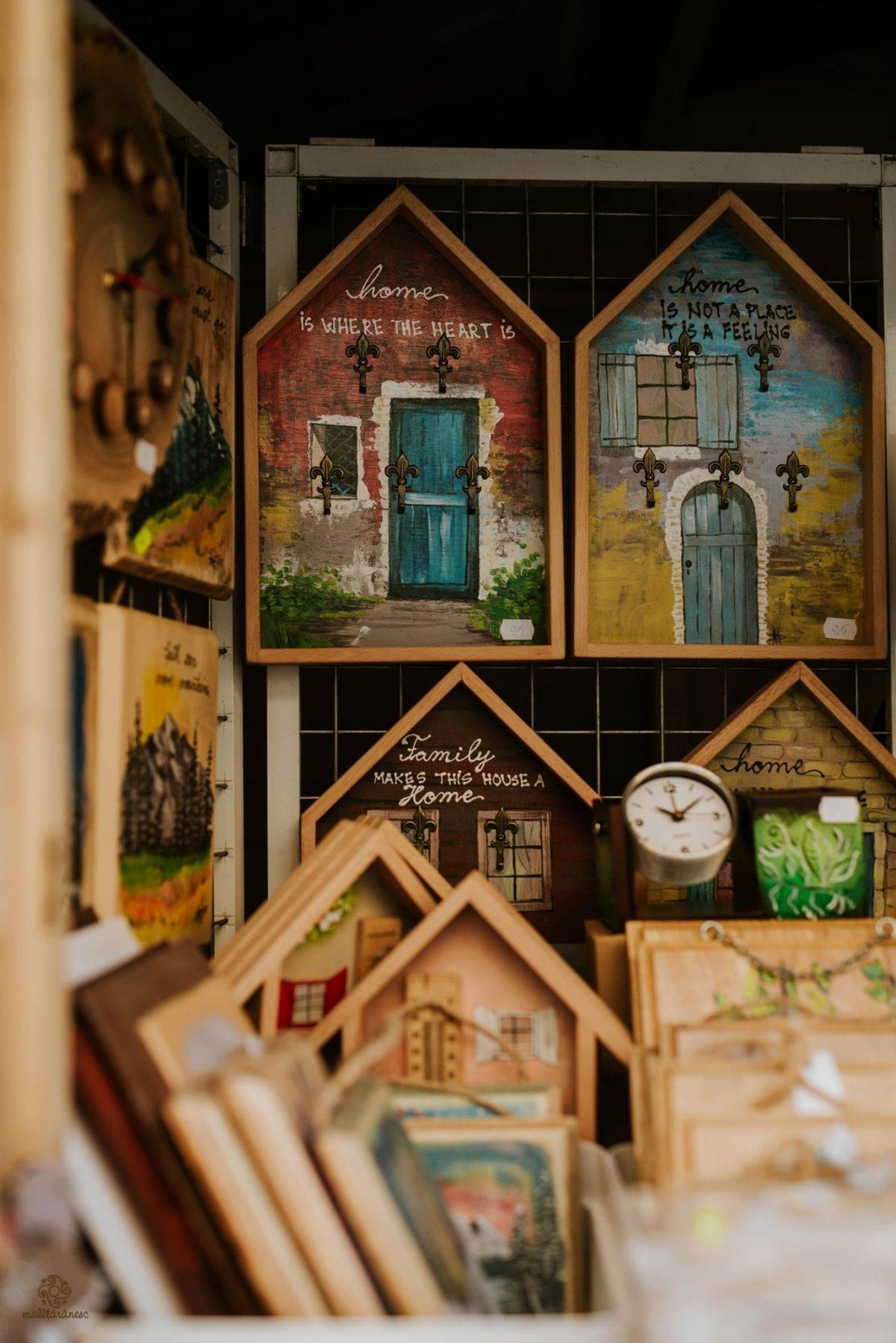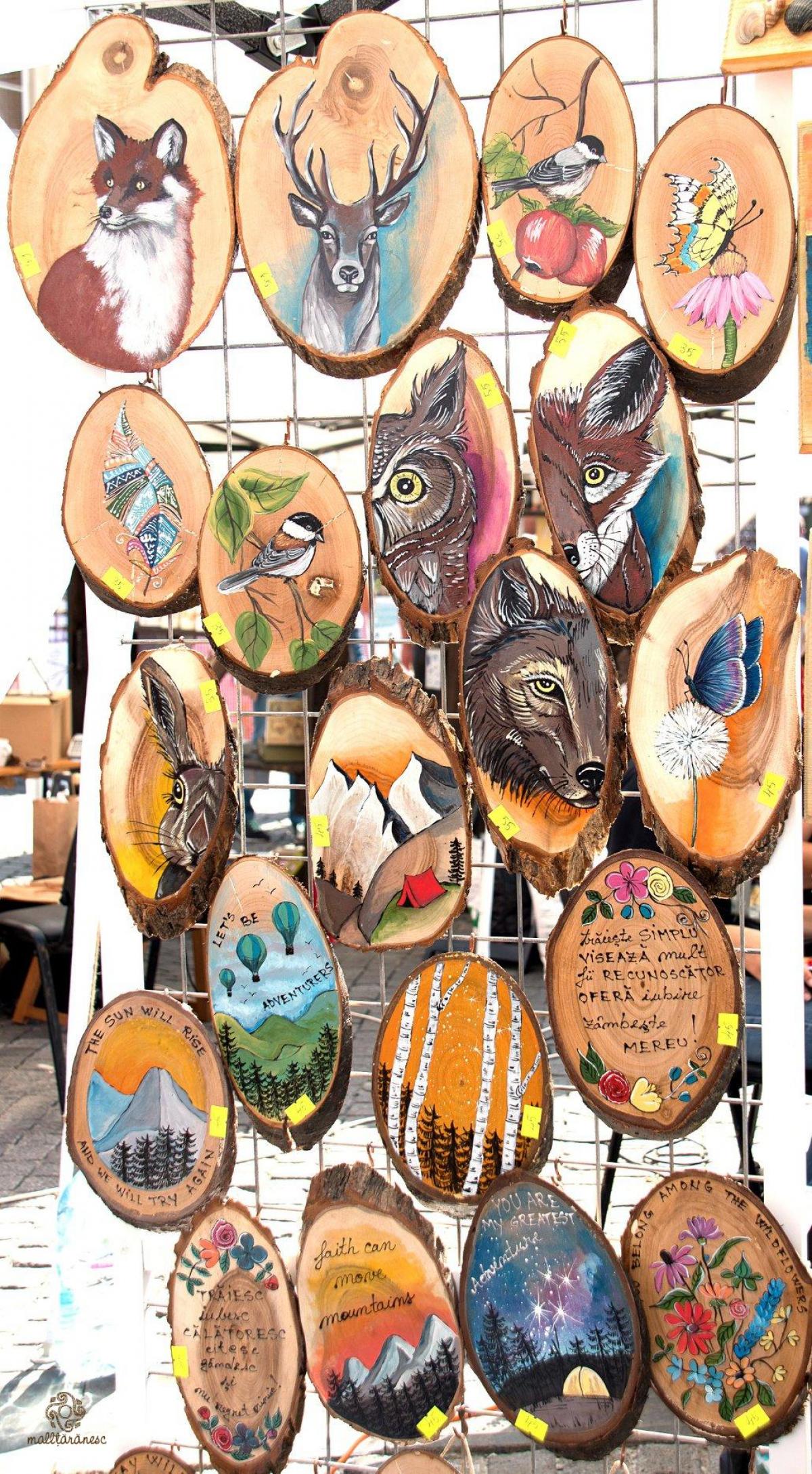 🖼 Tăvi pictate, realizate din lemn de cireș; căsuțe pentru chei colorate cu peisaje vesele de vară; agende realizate manual cu coperți pictate; veioze din corn de cerb cu abajur pictat manual; rame pentru fotografii; termometre pentru interior sau exterior; picturi pe lemn; oglinzi, cutii și jucării din lemn, colorate în toate nuanțele naturii și decorate cu flori de câmp sau peisaje înstelate.