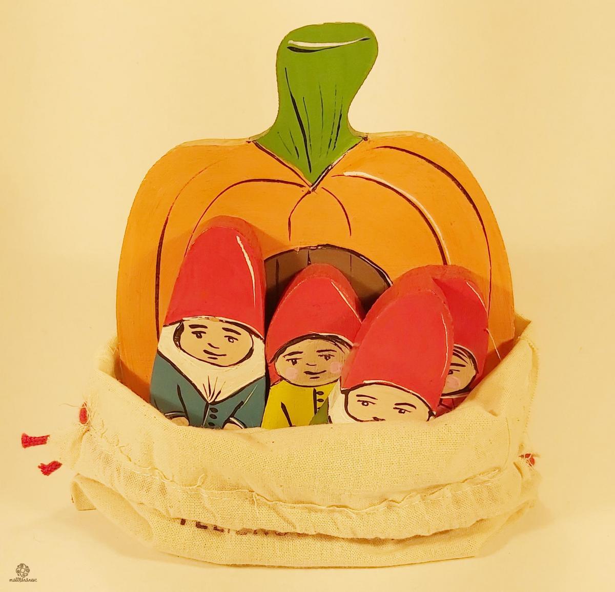 Casuta dovleac cu patru figurine din lemn de paulownia, pictate si realizate manual. Culorile folosite sunt ecologice, avizate pentru jucarii. Dimensiuni: casuta 13,5x16cm; figurinele H 9-9-8-8cm.