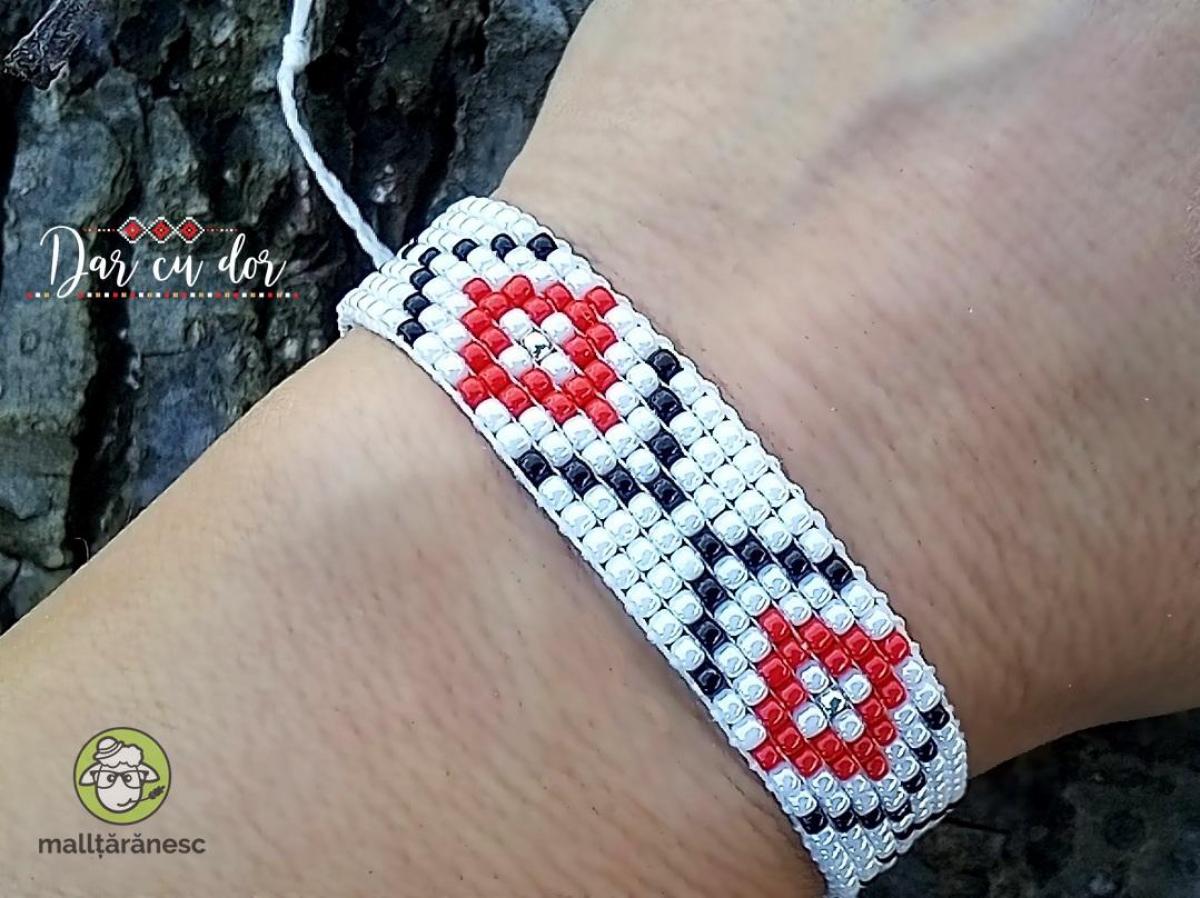 Motiv: romburi cu protecţie, rombul semnificând abundenţa. Culori: negru şi roşu, cu stropi discreţi de auriu. Brăţările cu motive tradiţionale "Dar cu dor" sunt lucrate exclusiv manual din mărgele mărunte şi foarte mărunte, numite şi "mărgele de nisip". Majoritatea lor au motive deosebite de ceea ce se găseşte ca tradiţional la tarabe. Nu sunt reproduceri ale bijuteriilor vechi, ci sunt compuneri noi din motive preluate de pe diverse elemente de artă populară. Câteva brăţări au motive originale. Sunt realizate cu mărgele de calitate, ceea ce se reflectă în ordonarea lor aproape perfectă, care fură privirea. Culorile mărgelelor nu se şterg în timp iar aţa folosită este deosebit de rezistentă. Brăţările cu motive tradiţionale din mărgele "Dar cu dor" sunt potrivite atât la straie de sărbătoare cât şi la ţinute moderne, fiind foarte apreciate de cei care se află peste graniţe şi chiar de către străini, care privesc cu multă admiraţie arta noastră populară. Fiecare brăţară se livrează gratuit pe cartonaş-suport. Produs realizat cu mărgelele de calitate, cu mărimea de 2mm, în culori vii şi luminoase, şi aţă rezistentă la care s-a adaugat un strop de drag şi pasiune.