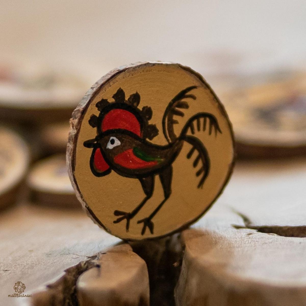 Broșă realizată pe felie de lemn cu diametrul de 2.5-3 cm.