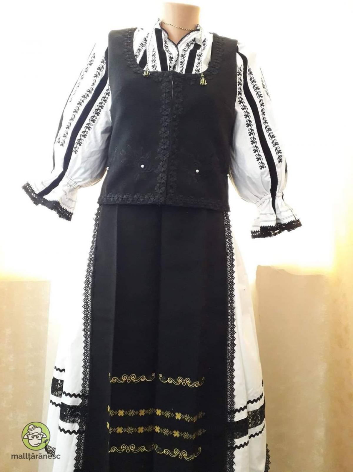 Costum popular zona Sibiu-Făgăraș format din ie, veste, fusta și cratinte. Materialele folosite sunt pânză de bumbac și postav, broderia este computerizata iar la mâneci și gulerul sunt elemente cusute manual, inclusiv incretitura gulerului. Cratintele sunt brodate cu fir metalic auriu