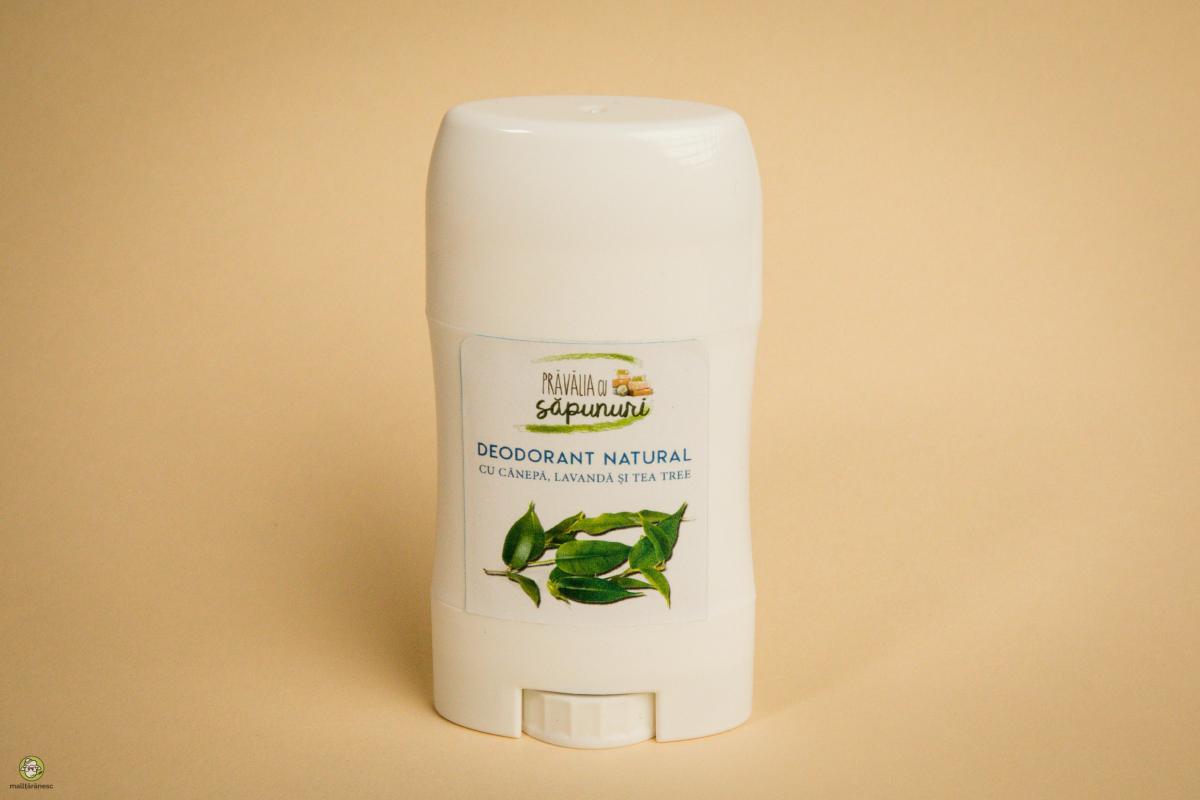 Acest produs este un deodorant natural. Are rolul de a inhiba producerea bacteriilor și a preveni apariția mirosului neplăcut al transpirației. Untul de shea și uleiul de canepa vor hrăni și hidrata pielea sensibilă a axilei, ajută la vindecarea iritațiilor, în cazul în care acestea vor apărea. Piatra de alaun este un cristal natural, un mineral recunoscut pentru proprietăţile sale astringente, antibacteriene şi hemostatice. Bicarbonatul de sodiu ajută la neutralizarea mirosurile neplăcut, limitează dezvoltarea bacteriană, fungicid. Amidonul de porumb are calitatea de a lăsa pielea suplă și netedă, fiind un antiseptic natural. Deodorantul natural conține uleiuri esențiale pure de lavandă, rozmarin și tea tree ce asigură o barieră antibacteriană eficientă. Ingrediente (INCI): THEOBROMA CACAO SEED BUTTER, CANNABIS SATIVA SEED OIL, CERA ALBA, OLEA EUROPAEA FRUIT OIL, BUTYROSPERMUM PARKII BUTTER, POTASSIUM ALUM, SODIUM BICARBONATE, STARCH, LAVANDULA ANGUSTIFOLIA OIL, MELALEUCA ALTERNIFOLIA LEAF OIL, ROSMARINUS OFFICINALIS OIL, LINALOOL, LIMONENE. Referinta CPNP: 2860737. Notificat la data: 06.11.2018.