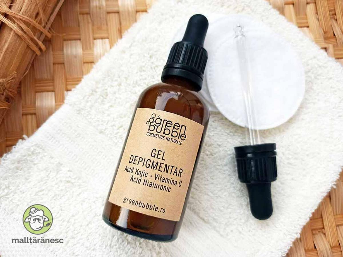Gel Depigmentar Antirid cu Acid Kojic, Vitamina C și Acid Hialuronic. Un produs potent și eficient pentru estomparea petelor de piele și a semnelor de îmbătrânire prematură.