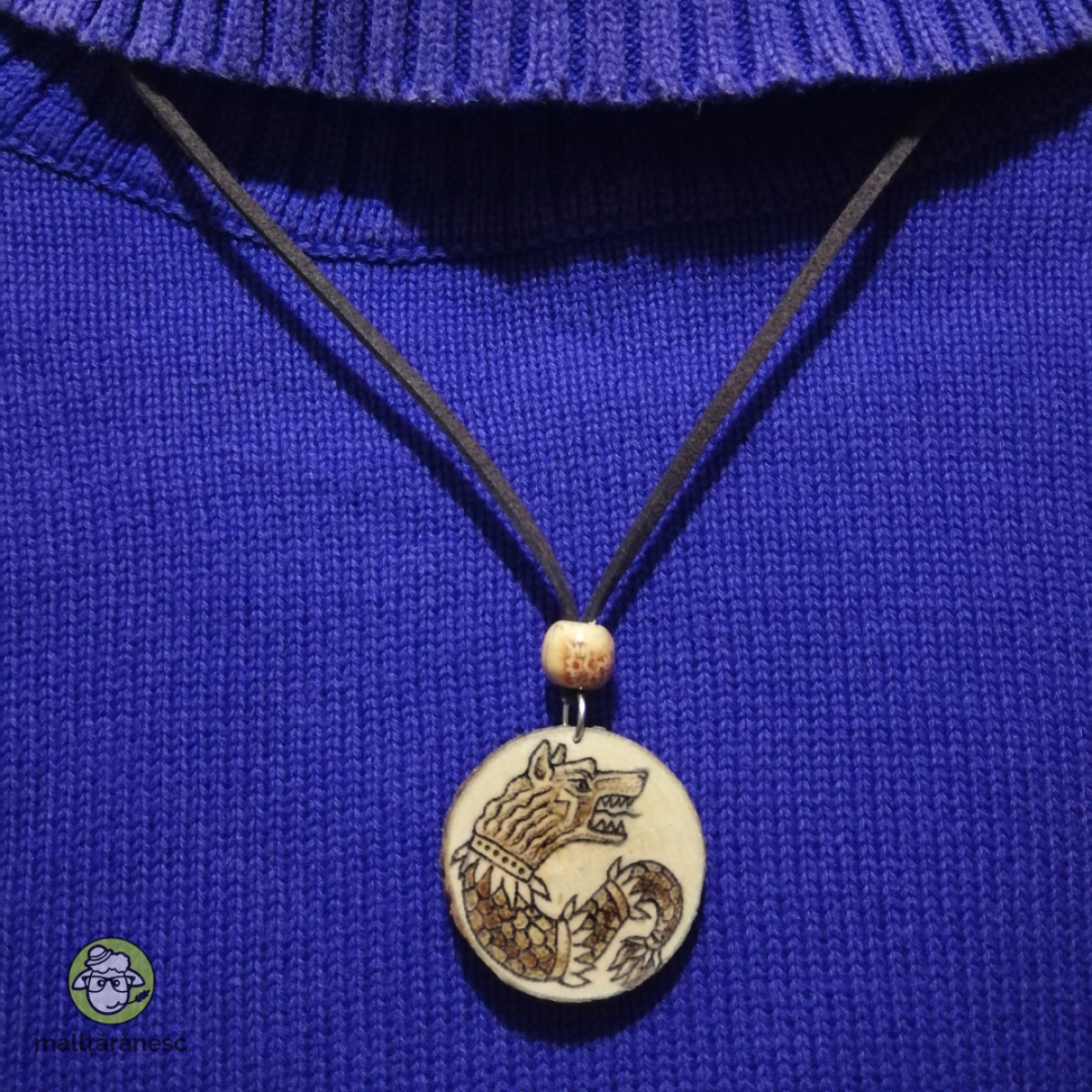Pirogravură pe felie de lemn reprezentând Stindardul armatei dacilor . Diametrul lemnului este de cca 3,5 cm. Șnurul este din piele naturală