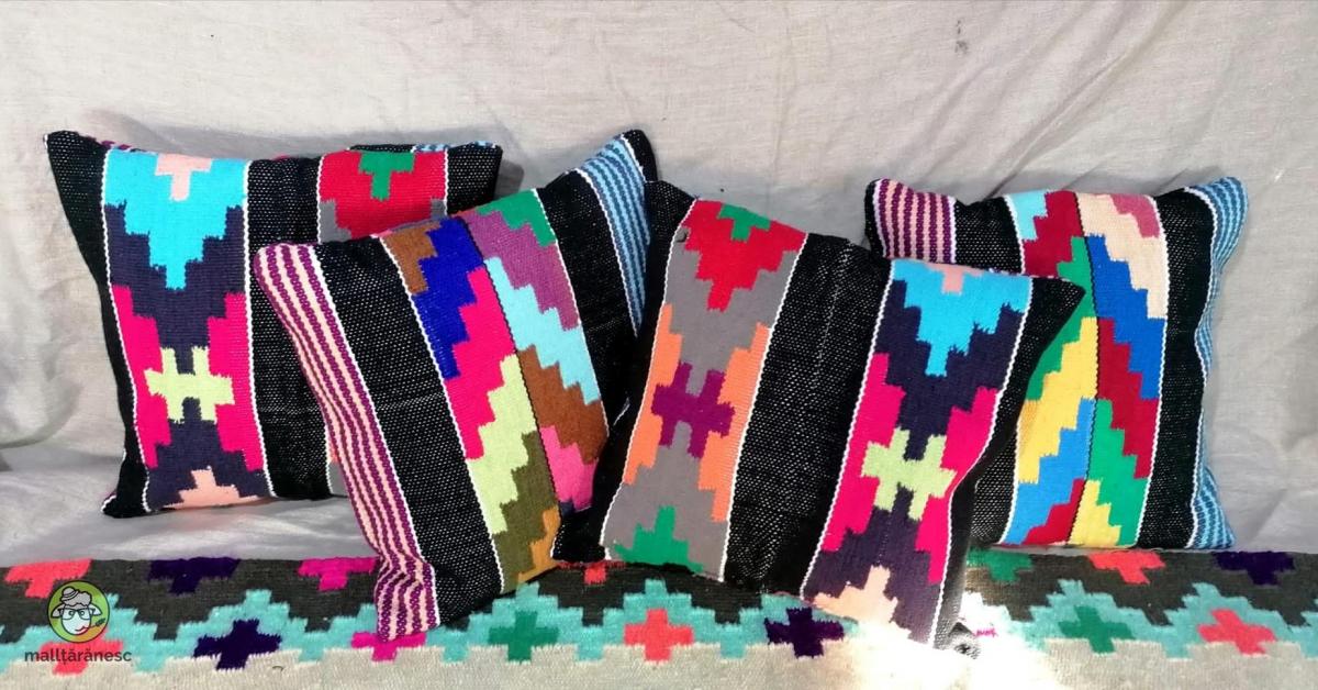 Perne decorative cu motive traditionale, tesute in stative, lana, umplute cu pene de gasca dimensiuni: 40/40 cm