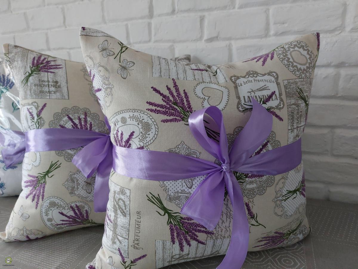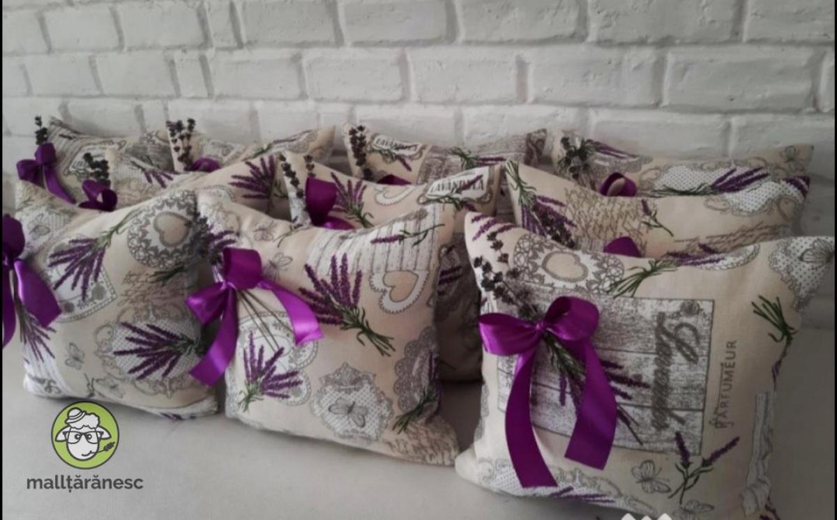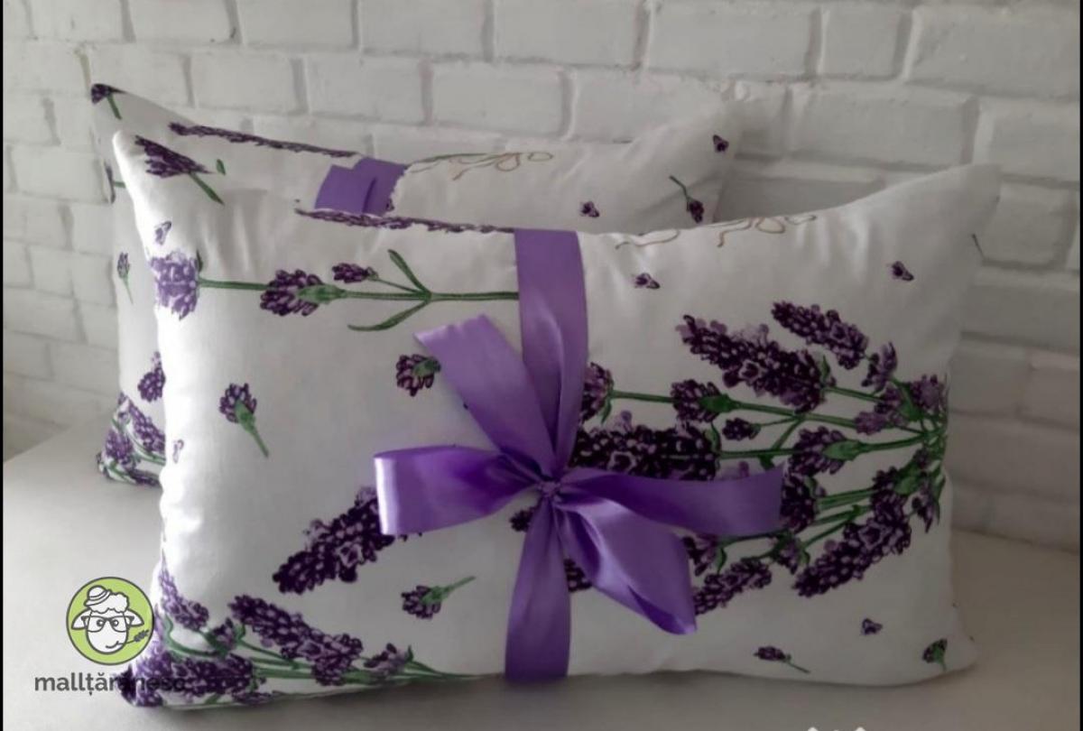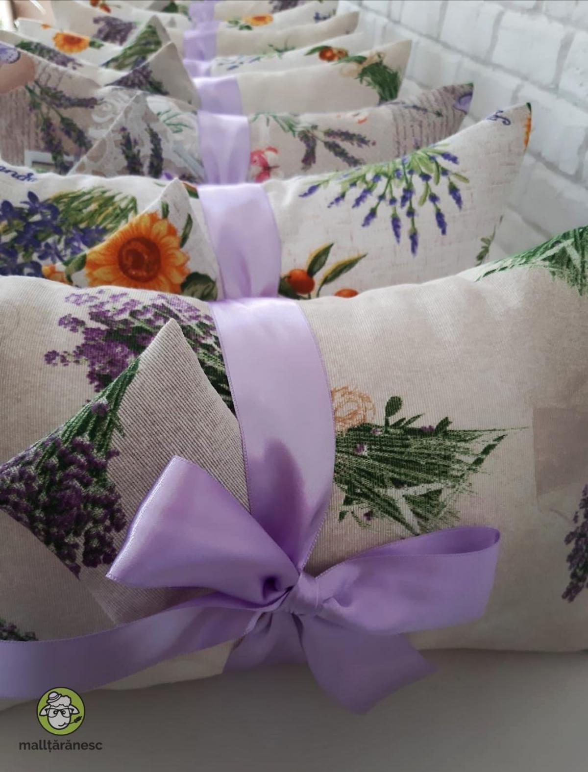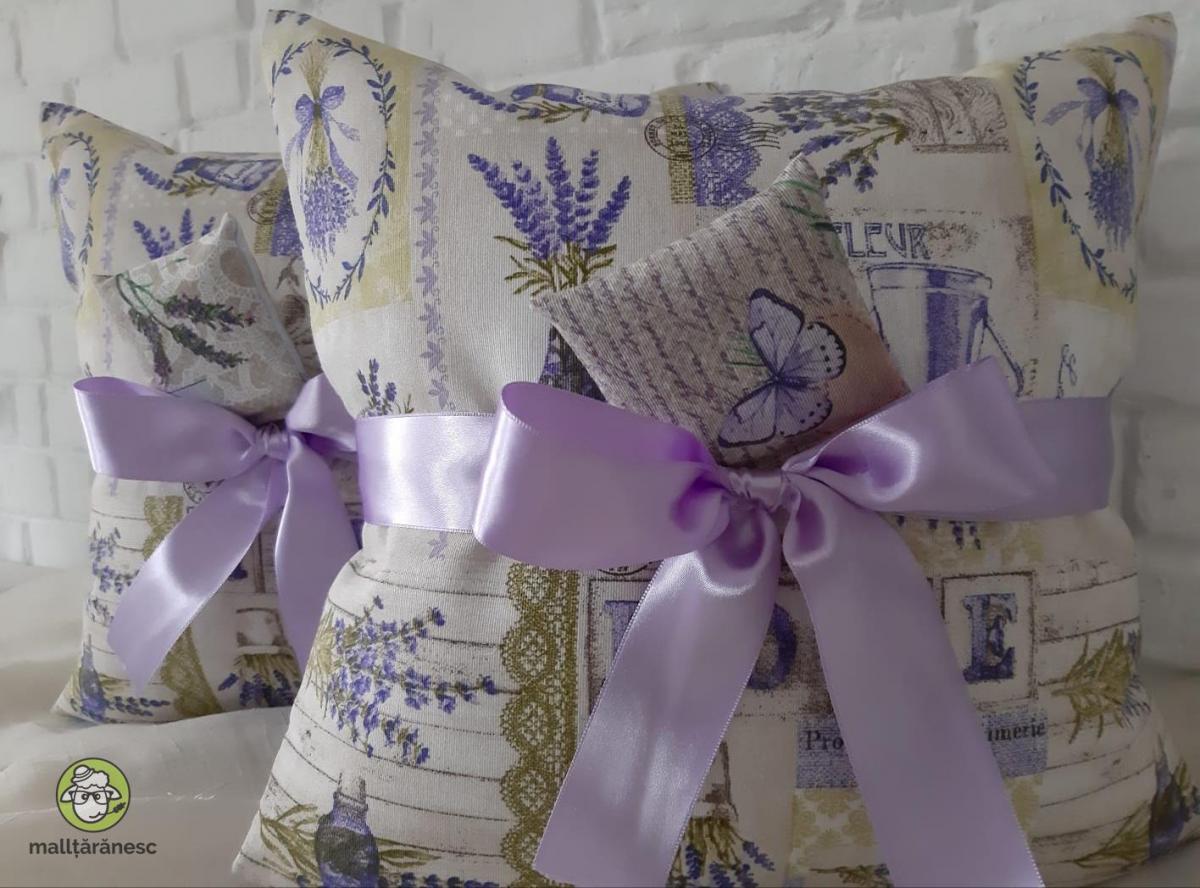 Perne decorative cu umplutură de floare de lavandă și puf antialergic, diverse dimensiuni. Floarea de lavandă este organică, netratată chimic.
