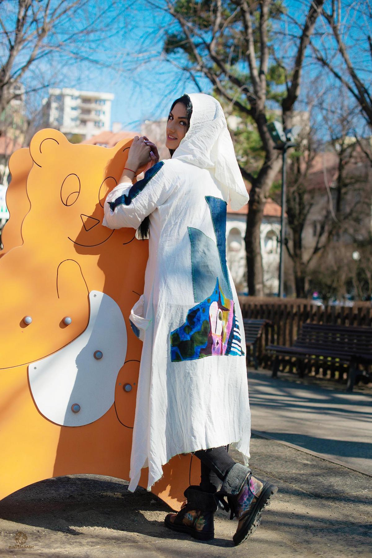 Rochie cu gluga din panza topita romaneasca.