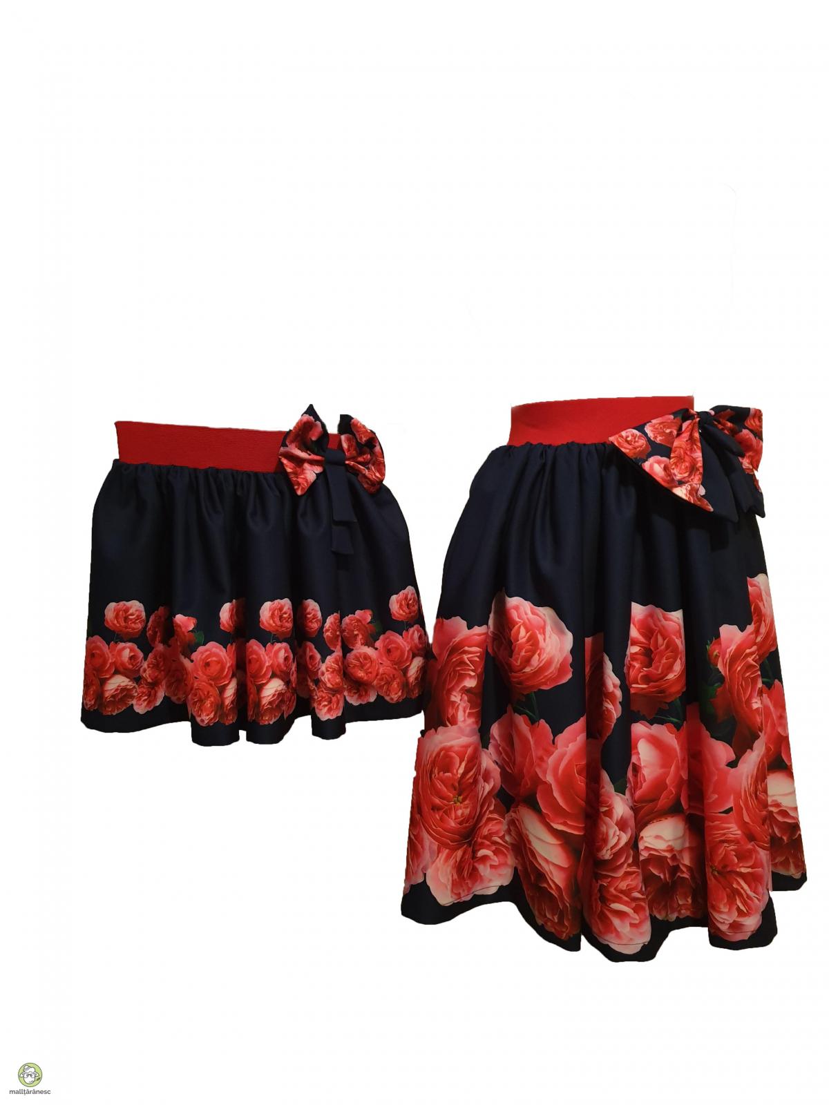 Primavara aceasta, este de rasfat pentru mama si fiica cu o fusta eleganta scurta din triplu voal imprimat digital, fundal bleumarin cu flori rosii, accesorizata cu o funda bleumarin cu imprimeu floral. Fusta eleganta scurta impresioneaza prin design-ul sau, care confera oricarei purtatoare o aparitie deosebita.Fusta scurta este alegerea ideala pentru petrecerile acestei primaveri. Textura deosebit de fina, cu o tinuta fluida. Compozitie rayon cu 2% elastan Intretinere - se spala manual - nu se usuca in masina de spalat - calcare la 40 grade pe spate