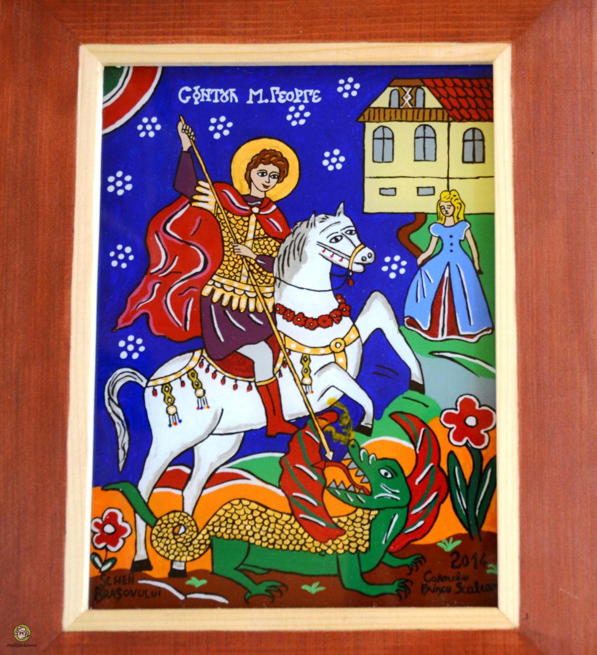 Pictura naiva pe sticla. Stil de creatie Scheii Brasovului. Tehnica de realizare: pictura pe dosul sticlei in ulei si acril. Marimea sticlei 23x18 cm