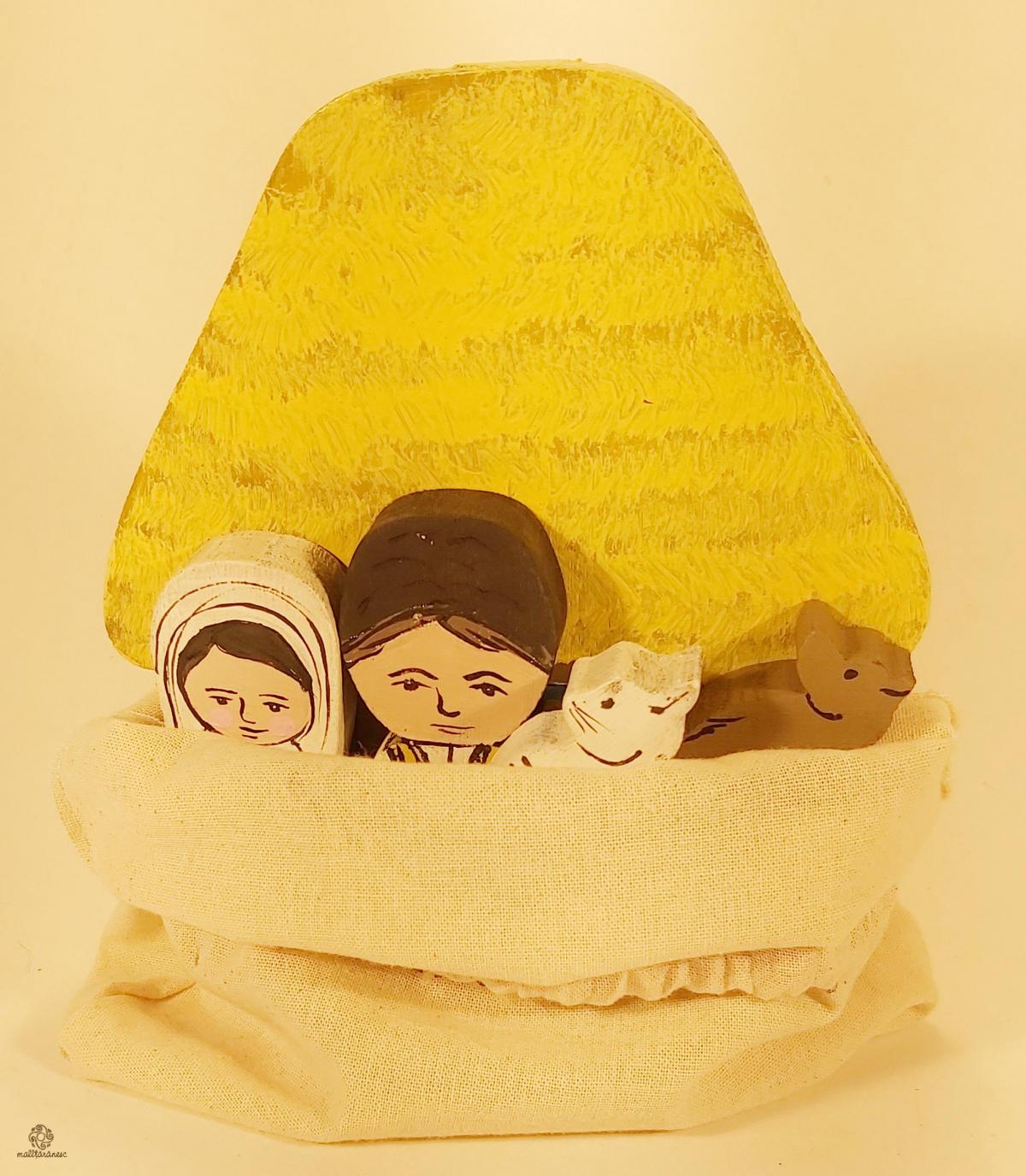Casuta taraneasca cu patru figurine din lemn de paulownia, pictate si realizate manual. Culorile folosite sunt ecologice, avizate pentru jucarii.