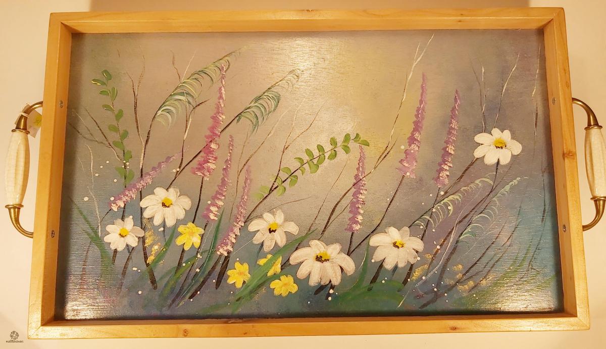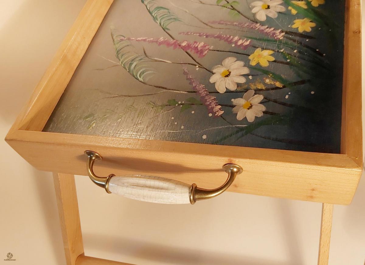 Tava din lemn de cires, pictata si realizata manual, cu picioare pliabile. Maner cu portelan. Dimensiuni 35x55cm, inaltime 24,5 cm.