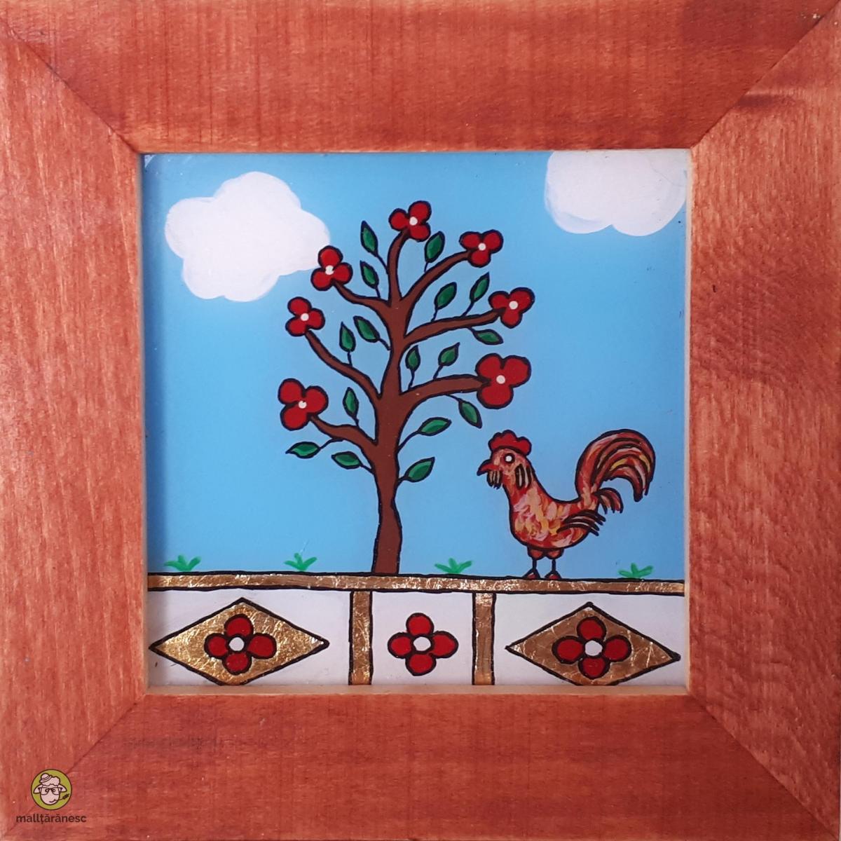 Cocosul transilvan- pictura naiva pe sticla. Tehnica de realizare: pictura pe dosul sticlei in ulei si acril. Marimea sticlei 11x11 cm