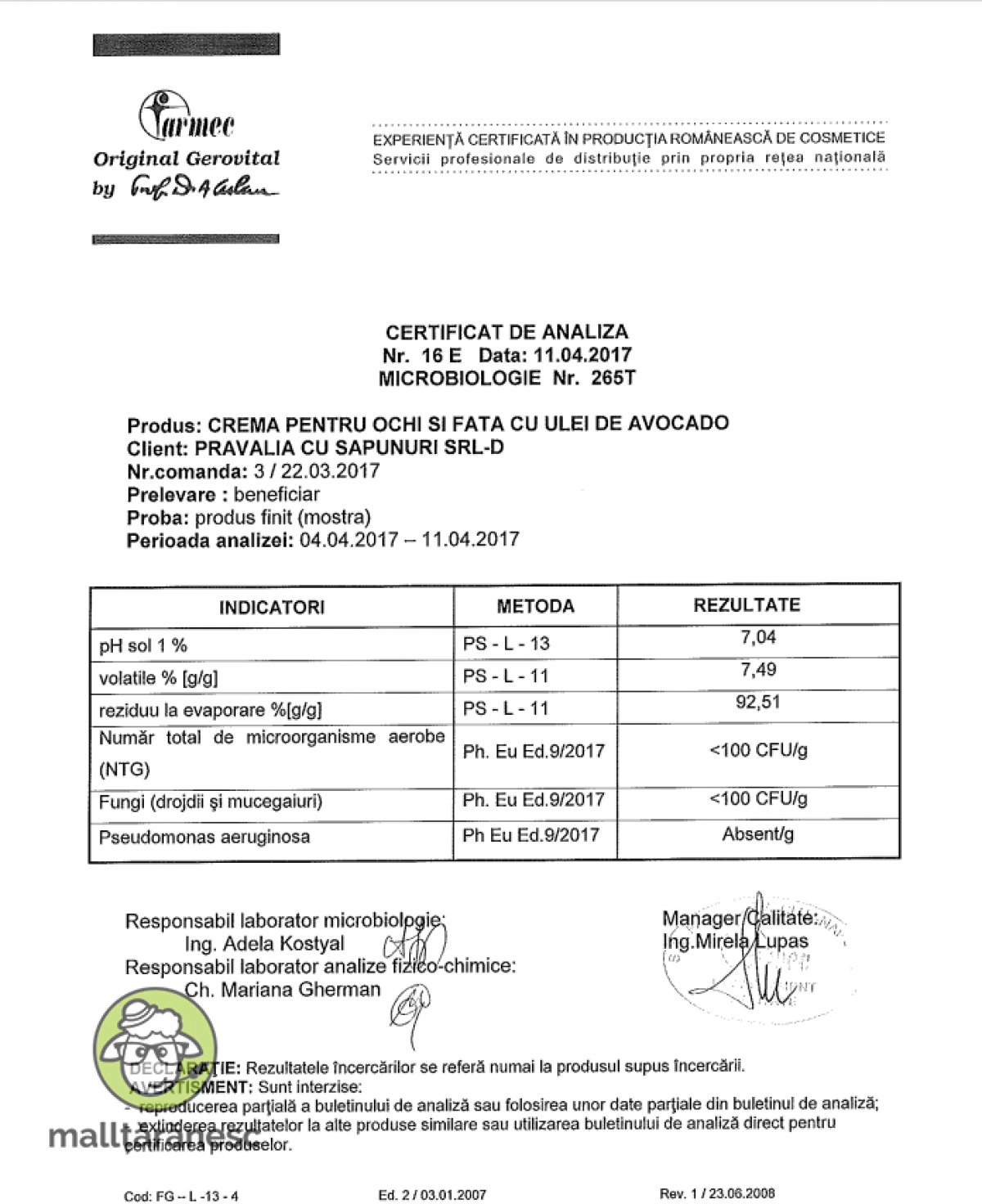Hidratează intens, calmează inflamaţiile, permite compensarea pierderilor de apă din ten, are calități nutritive, cicatrizante, ajută în repararea pielii, efect antirid. Referinta CPNP: 2860743 Notificat: 06.11.2018