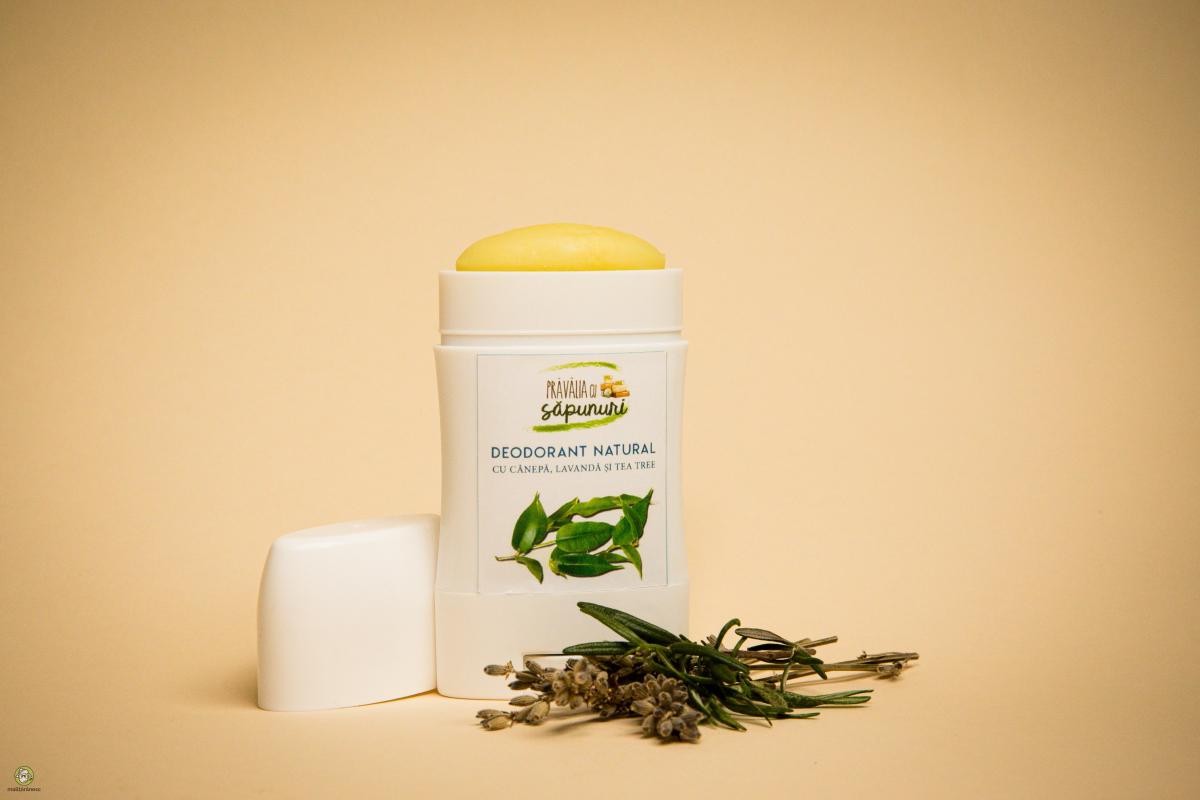 Acest produs este un deodorant natural. Are rolul de a inhiba producerea bacteriilor și a preveni apariția mirosului neplăcut al transpirației. Untul de shea și uleiul de canepa vor hrăni și hidrata pielea sensibilă a axilei, ajută la vindecarea iritațiilor, în cazul în care acestea vor apărea. Piatra de alaun este un cristal natural, un mineral recunoscut pentru proprietăţile sale astringente, antibacteriene şi hemostatice. Bicarbonatul de sodiu ajută la neutralizarea mirosurile neplăcut, limitează dezvoltarea bacteriană, fungicid. Amidonul de porumb are calitatea de a lăsa pielea suplă și netedă, fiind un antiseptic natural. Deodorantul natural conține uleiuri esențiale pure de lavandă, rozmarin și tea tree ce asigură o barieră antibacteriană eficientă. Ingrediente (INCI): THEOBROMA CACAO SEED BUTTER, CANNABIS SATIVA SEED OIL, CERA ALBA, OLEA EUROPAEA FRUIT OIL, BUTYROSPERMUM PARKII BUTTER, POTASSIUM ALUM, SODIUM BICARBONATE, STARCH, LAVANDULA ANGUSTIFOLIA OIL, MELALEUCA ALTERNIFOLIA LEAF OIL, ROSMARINUS OFFICINALIS OIL, LINALOOL, LIMONENE. Referinta CPNP: 2860737. Notificat la data: 06.11.2018.