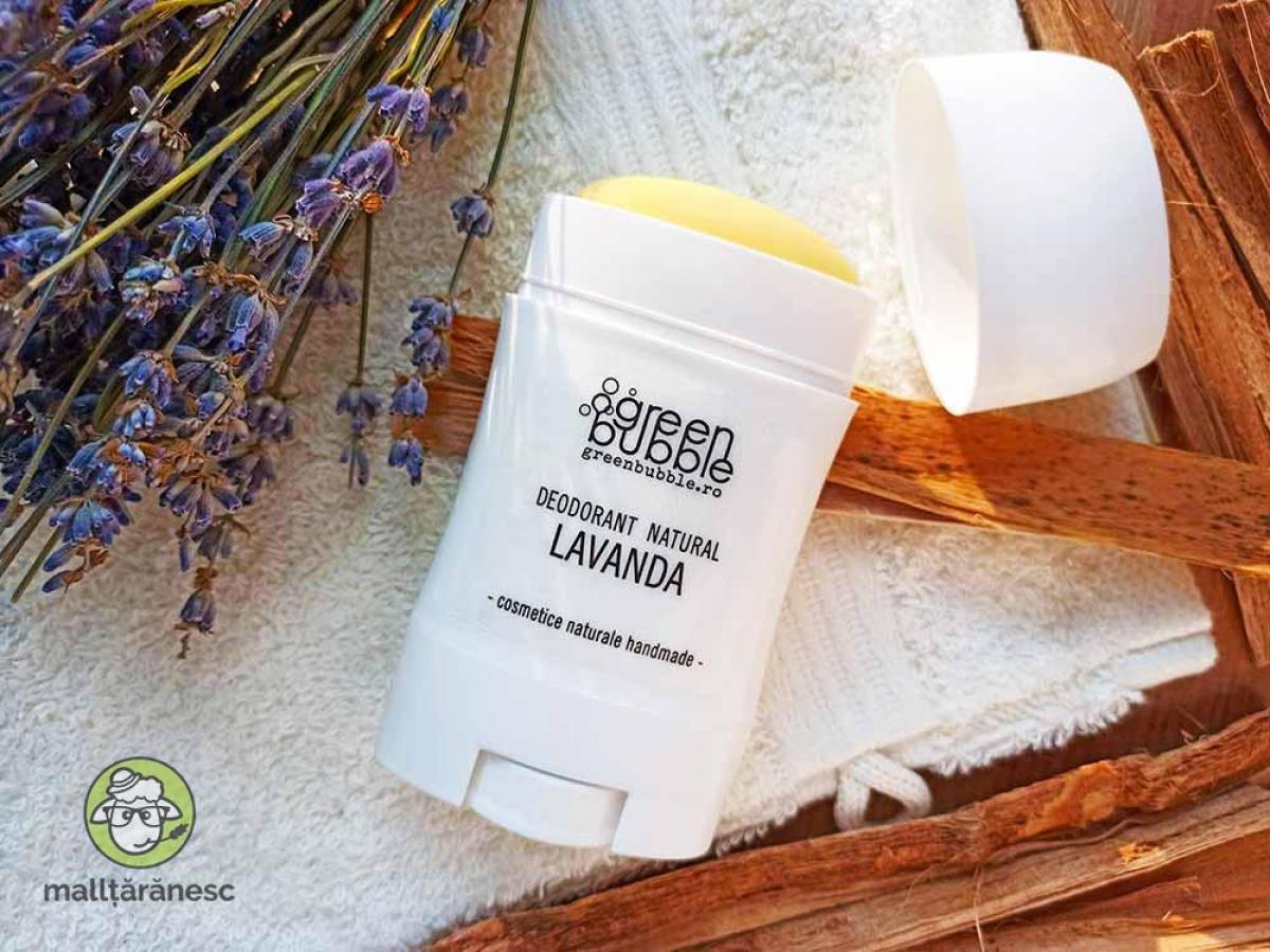 Deodorant Natural Lavandă cu Bicarbonat este emolient și eficient în combaterea și apariția mirosurilor neplăcute. Deodorantul este activ o zi întreagă. Produsul are un miros natural de flori proaspete de lavandă. Deodorantul acționează eficient împotriva mirosurilor neplăcute care se dezvoltă în urma transpirației și nu blochează porii pielii. Ingredientele folosite în acest deodorant nu afectează negativ flora naturală a pielii. Deodorantul se aplică ușor, iar mirosul floral de lavandă este subtil. Principalele ingrediente active pentru Deodorant Natural Lavandă cu Bicarbonat: Deodorantul este realizat cu Ulei de Cocos, Bicarbonat, Amidon, Ulei Esențial de Lavandă. Uleiul de Cocos Uleiul de Cocos este un ulei care hidratează și calmează pielea afectată de roșeață și iritații. Este un ingredient nutritiv, emolient, care lasă pielea fină, moale și îngrijită. Bicarbonatul de Sodiu Bicarbonatul de sodiu este un ingredient ecologic și biodegradabil cu proprietăți dezodorizante. Neutralizează mirosurile neplăcute și limitează dezvoltarea bacteriană. Amidon Amidonul absoarbe eficient excesul de sebum și transpirația pielii, menținând-o uscată. Ulei Esențial Lavandă Este probabil cel mai recunoscut şi răspândit ulei esenţial datorită multiplelor virtuți pe care le are. Uleiul esențial de lavandă este utilizat în creme prentru atenuarea diverselor probleme de piele și pentru regenerarea pielii. Uleiul esențial de lavandă este apreciat pentru parfumul său deosebit care favorizează somnul și calmează sistemul nervos. Uleiul esențial de lavandă este cicatrizant, regenerator și reparator pentru piele, ajută la refacerea pielii rănite, afectate de eczeme, urticarii, psoriazis, acnee, liniștește pielea rănită, înroșită, arsă de soare sau înțepată de insecte. Acest ulei este un echilibrant al sistemului nervos. Mod de Utilizare/Aplicare Deodorant Natural Lavandă cu Bicarbonat Cu doar o cantitate mică se combate eficient mirosul corporal și te poate proteja toată ziua. Pe pielea curată și uscată, se aplică cu una sau doua glisări ușoare sub axilă sau în zonele dorite. Nu încărca prea mult pielea, altfel produsul se poate transfera pe haine. Ingredientele folosite în acest deodorant nu afectează negativ flora naturală a pielii.