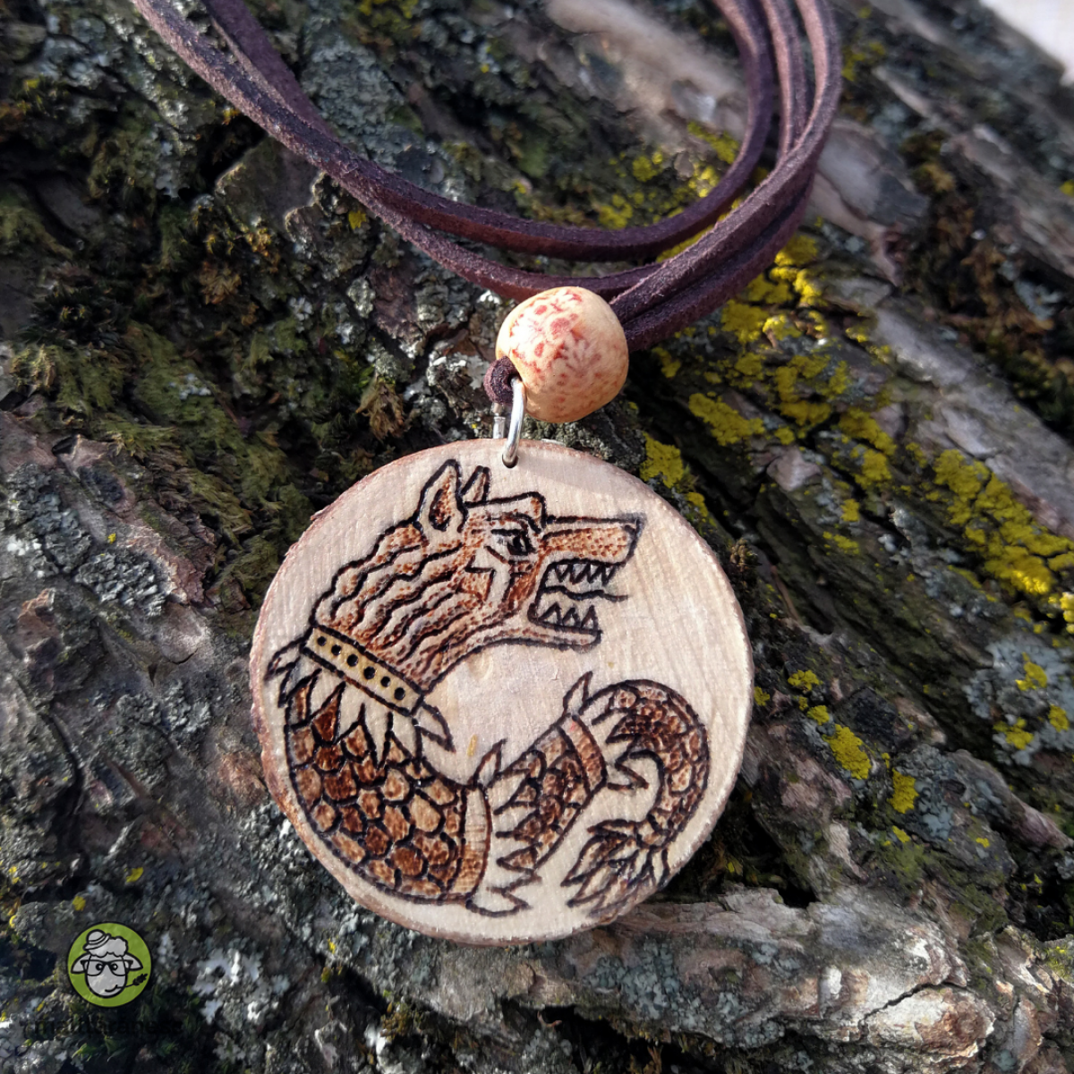 Pirogravură pe felie de lemn reprezentând Stindardul armatei dacilor . Diametrul lemnului este de cca 3,5 cm. Șnurul este din piele naturală