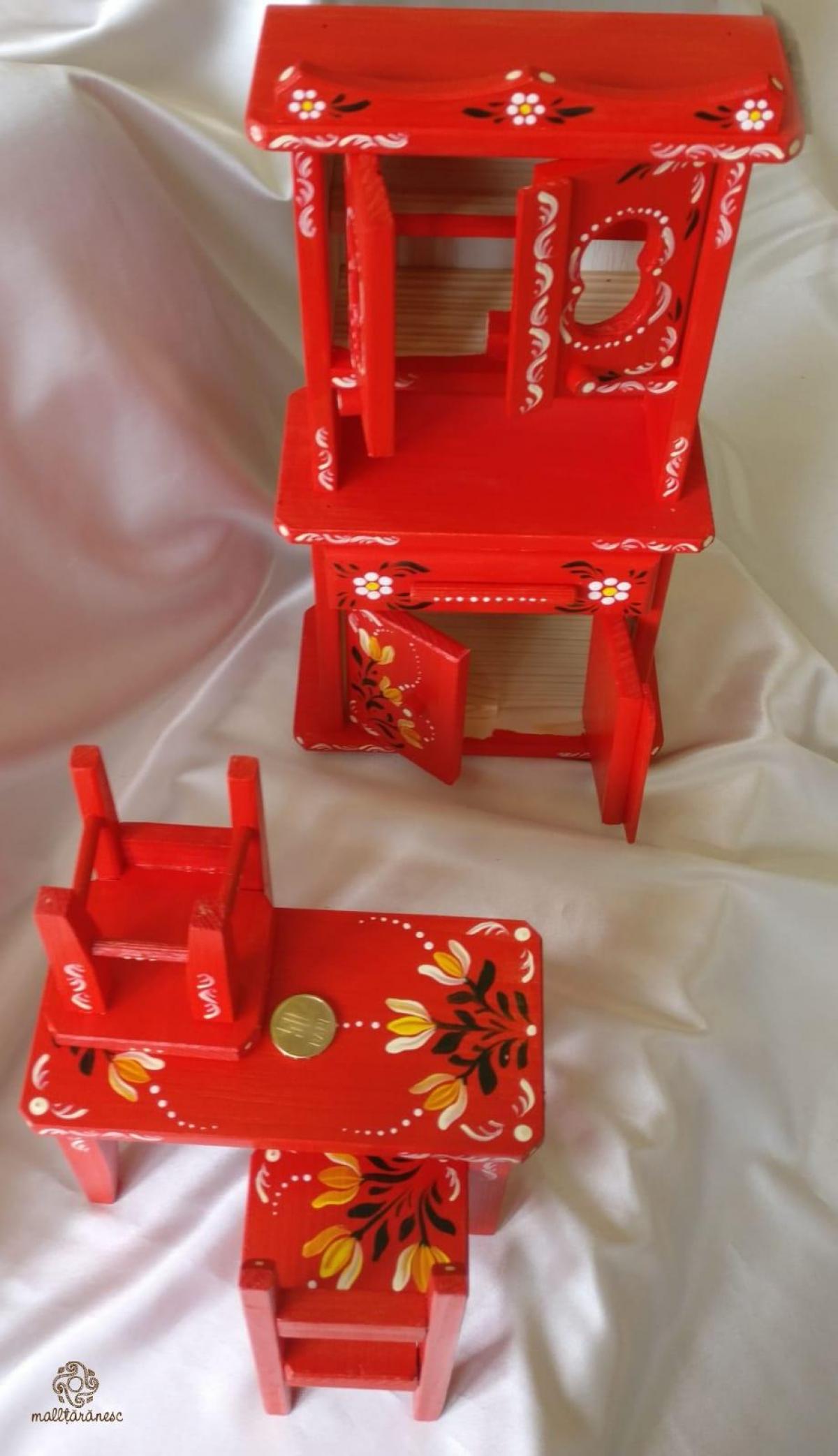 Acest mini mobilier de bucătărie, fabricat din lemn și decorat cu modele tradiționale ardelenesti de către artizanii Zestrea hh, este ideal pentru o căsuță de păpuși din lemn, sau ca și cadou făcut cu o ocazie specială.