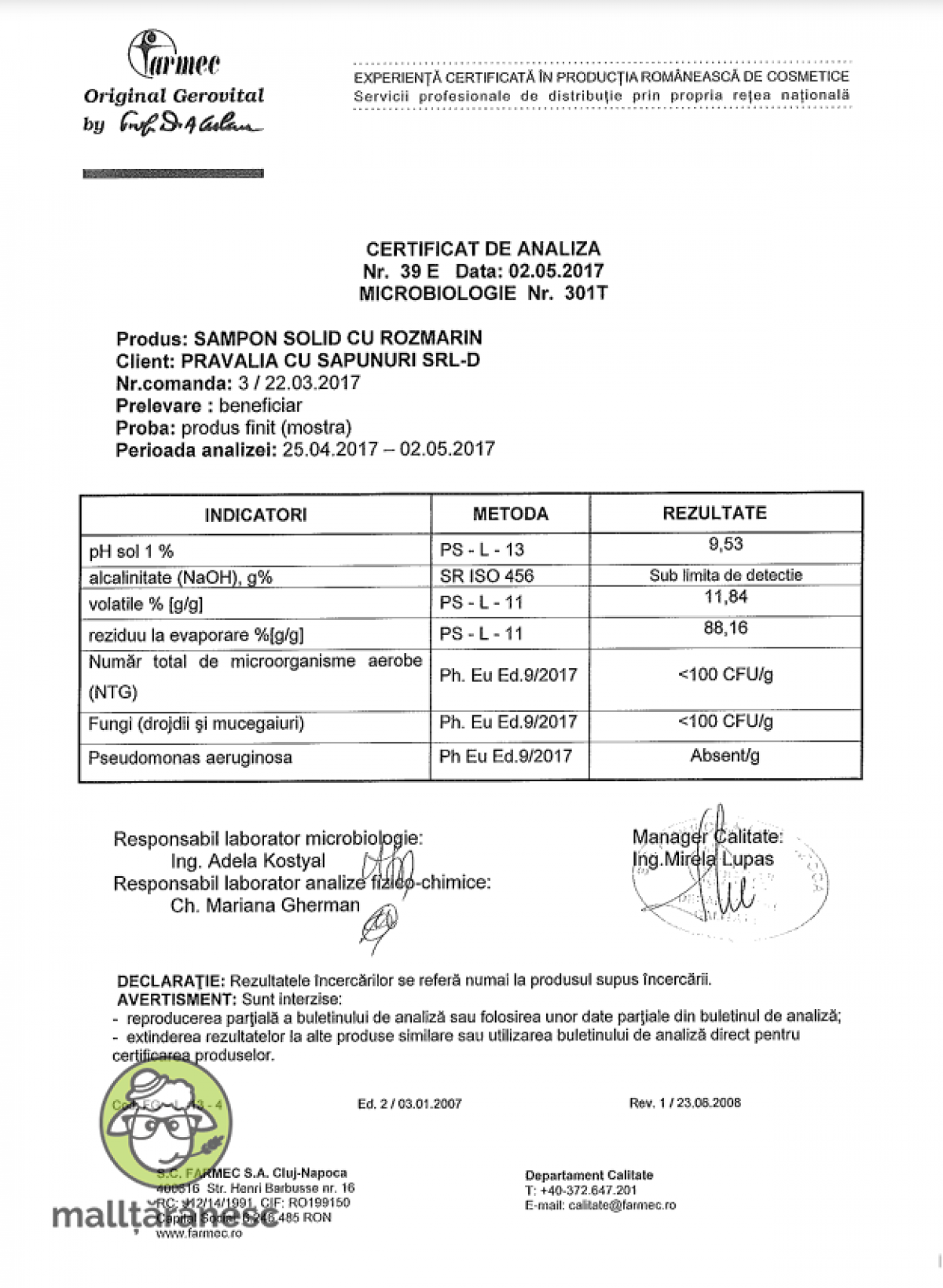 Acest şampon solid are efecte antimătreaţă, stimulează regenerarea şi creşterea părului, repară părul degradat, reglează secreţia de sebum ajutând pielea capului să respire. Mod de utilizare: Şamponaţi şi masaţi bine părul cu spuma rezultată timp de 2-3 minute, pentru a se distribui uniform. Este recomandat ca la fiecare spălare să vă şamponaţi de 2-3 ori până când aveţi senzaţia de păr mătăsos, ce “scârţâie de curăţenie”. După spălare, vă puteţi clăti cu apă în care aţi diluat puţin oţet. Cantitate: 100g±5g ℮ Ingrediente (INCI): OLEA EUROPAEA FRUIT OIL, AQUA, COCOS NUCIFERA OIL, SODIUM HYDROXIDE, RICINUS COMMUNIS SEED OIL, BRASSICA CAMPESTRIS SEED OIL, TRITICUM VULGARE GERM OIL, ROSMARINUS OFFICINALIS OIL, THYMUS VULGARIS FLOWER/LEAF OIL, LIMONENE, LINALOOL. Referinta CPNP: 3612093 Notificat 21.02.2021