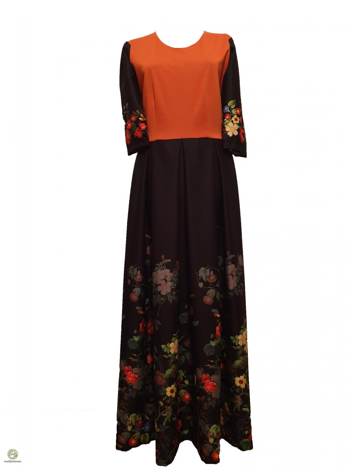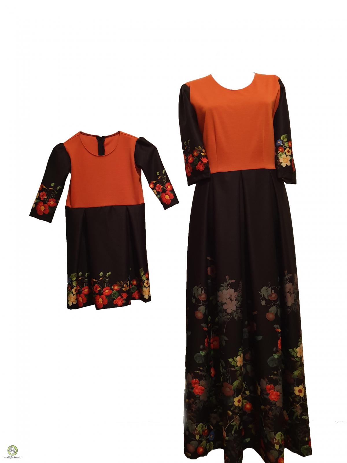 Rochie superba,din triplu voal barbie negru cu imprimeu floral partea de jos,cute duble in talie si in partea de sus din jerse de culoarea portocalie,are maneci 3/4 are fermoar ascuns.Rochia fetitei este din material triplu voal barbie negru cu bordura florala partea de jos si partea de sus din jerse de culoarea portocalie. Textura deosebit de fina, cu o tinuta fluida. Compozitie rayon cu 2% elastan Intretinere - se spala manual - nu se usuca in masina de spalat - calcare la 40 grade pe spate
