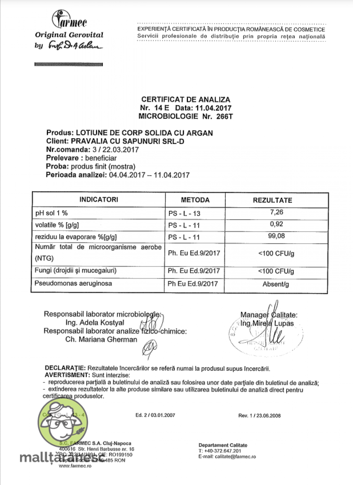 Loțiune nutritivă, emolientă, regeneratoare și hidratantă, ce sporește elasticitatea și suplețea pielii. Uleiul de argan regenerează, hrăneşte şi hidratează pielea, reface bariera hidrolipidică, combate îmbătrânirea cutanată şi contribuie la reducerea celulitei. Este ideal pentru tratarea eczemelor, cicatricilor sau arsurilor de pe piele. Este eficient și în tratarea vergeturilor în special cele de pe burta femeilor gravide. Untul obţinut din boabele de cacao este una dintre cele mai stabile grăsimi vegetale. Conferă excelente proprietăți nutritive și emoliente. Untul de Shea hrănește pielea cu vitaminele A, E și F. Acestea contribuie la menținerea sănătății pielii, ajutând-o să rămână fină și sănătoasă. Aceste vitamine fac minuni pentru persoanele a căror piele a fost afectată de expunerile repetate la soare. Reușește să estompeze petele astfel apărute. Uleiul de cocos este un produs de înfrumuseţare datorită proprietăţilor sale antibacteriene şi antifungice. În plus este un produs hidratant şi foarte grijuliu cu epiderma noastră. Tocoferolul sau vitamina E este esențială pentru sănătatea pielii. Ingrediente (INCI): BUTYROSPERMUM PARKII BUTTER, COCOS NUCIFERA OIL, THEOBROMA CACAO SEED BUTTER, ARGANIA SPINOSA KERNEL OIL, PRUNUS AMYGDALUS DULCIS OIL, TOCOPHERYL Mod de utilizare: Se aplică o cantitate mică pe zonele aferente prin masaj uşor şi confortabil, odată sau de două ori pe zi. Cantitate: 100ml ℮ Referinta CPNP: 2860731. Notificat la data: 06.11.2018